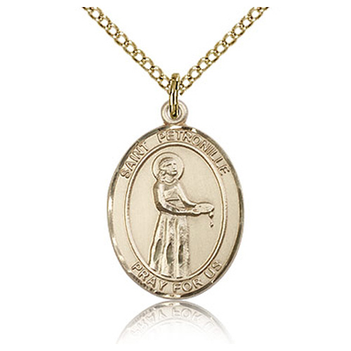 This oval gold filled sterling silver St Petronille medal is die struck and hand-engraved. Inscription: SAINT PETRONILLE PRAY FOR US. 18-inch gold-plated sterling silver lite curb chain with lobster clasp. Dimensions: 3/4in x 1/2in. This item is the size of a penny. Made in USA.