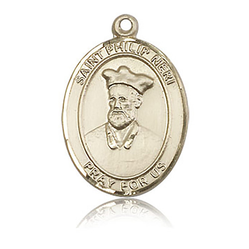 Die struck, hand-engraved St Philip Neri medal is made of polished, solid 14k yellow gold. Inscription: SAINT PHILIP NERI PRAY FOR US. Dimensions: 1in x 3/4in. This item is the size of a quarter. Made in USA.