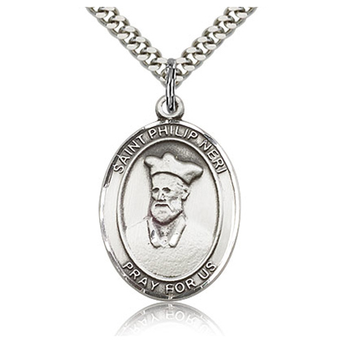 This sterling silver oval St Philip Neri medal dangles from a 24-inch stainless steel endless heavy curb chain with silver plating. Medal size: 1in x 3/4in. This item is the size of a quarter. Inscription: SAINT PHILIP NERI PRAY FOR US. Die struck, hand-engraved medal is made in USA.
