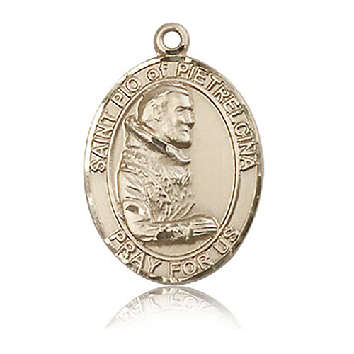 Die struck, hand-engraved medal is made of polished, solid 14kt yellow gold. Inscription: SAINT PIO of PIETRELCINA PRAY FOR US. Dimensions: 1in x 3/4in. This item is the size of a quarter. Made in USA.