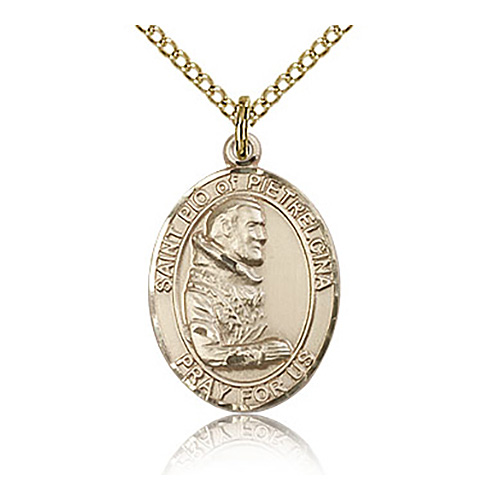 Die struck, hand-engraved St Pio medal is made of gold filled sterling silver. Dimensions: 3/4in x 1/2in. Inscription: SAINT PIO of PIETRELCINA PRAY FOR US. 18-inch gold-plated sterling silver lite curb chain with lobster clasp. This item is the size of a penny. Made in USA.
