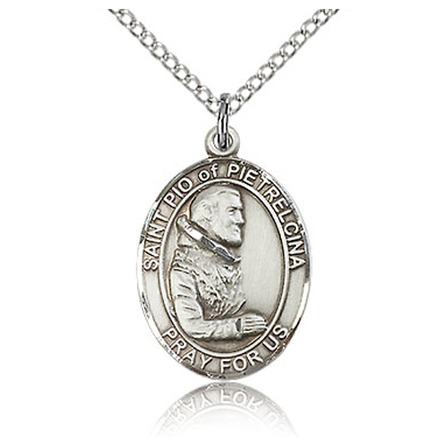 Die struck, hand-engraved medal. Inscription: SAINT PIO of PIETRELCINA PRAY FOR US. 18-inch sterling silver lite curb chain with lobster clasp. Dimensions: 3/4in x 1/2in. This item is the size of a penny. Made in USA.
