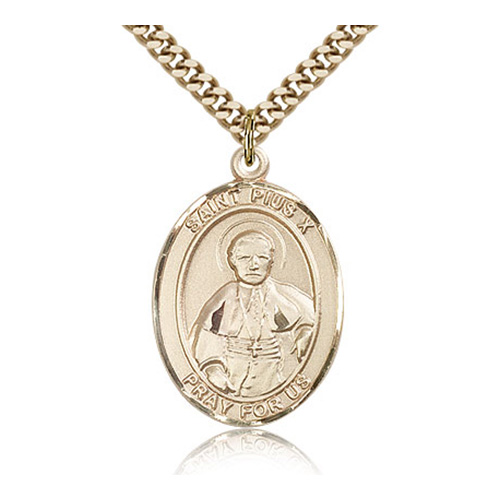 Die struck, hand-engraved medal. Inscription: SAINT PIUS X PRAY FOR US. 24-inch stainless steel, endless heavy curb chain with gold plating. Dimensions: 1in x 3/4in. This item is the size of a quarter. Made in USA.