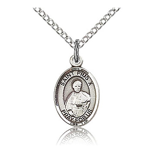 Die struck, hand-engraved St Pius X charm. Free 18-inch sterling silver lite curb chain with lobster clasp. Plain back. Dimensions: 1/2in x 1/4in. This item is half the size of a quarter. Made in USA.