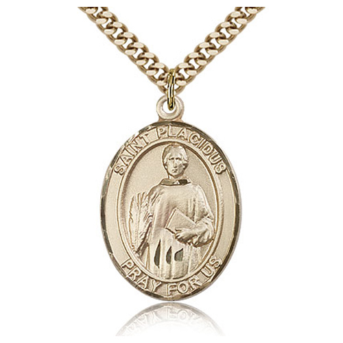 Die struck, hand-engraved medal. Inscription: SAINT PLACIDUS PRAY FOR US. Free 24-inch stainless steel, endless heavy curb chain with gold plating. Dimensions: 1in x 3/4in. This item is the size of a quarter. Made in USA.