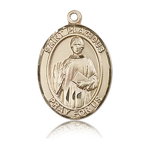 Die struck, hand-engraved St. Placidus medal is made of polished, solid 14k yellow gold. Inscription: SAINT PLACIDUS PRAY FOR US. Dimensions: 1in x 3/4in. This item is the size of a quarter. Made in USA.