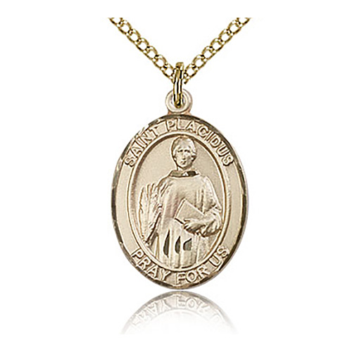St Placidus die struck, hand-engraved medal is made of gold filled sterling silver. Inscription: SAINT PLACIDUS PRAY FOR US. 18-inch gold-plated sterling silver lite curb chain has a lobster clasp. Dimensions: 3/4in x 1/2in. This item is the size of a penny. Made in USA.