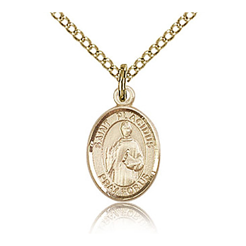 This very small gold filled sterling silver St Placidus charm dangles from a gold plated, sterling silver 18-inch curb chain with lobster clasp. Plain back. Dimensions: 1/2in x 1/4in. This item is half the size of a quarter. Die struck, hand-engraved. Made in USA.