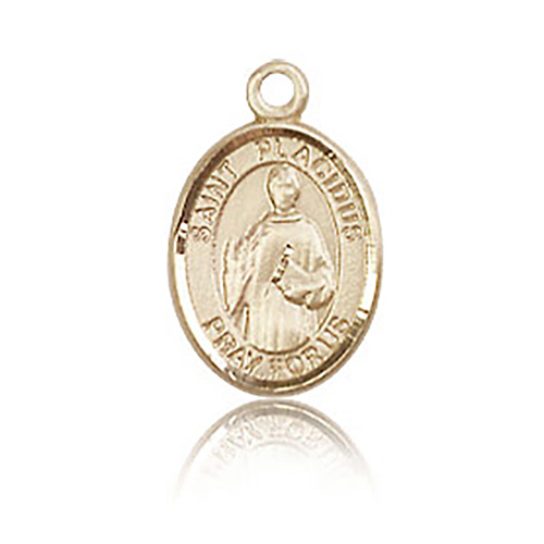 This very small oval St Placidus medal is made of solid 14k yellow gold. Inscription: SAINT PLACIDUS PRAY FOR US. Dimensions: 1/2in x 1/4in. This item is half the size of a quarter. Die struck, hand-engraved. Made in USA.