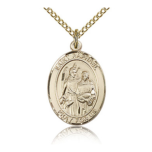 Die struck, hand-engraved St Raphael medal is made of gold-plated sterling silver. Dimensions: 3/4in x 1/2in. Inscription: SAINT RAPHAEL PRAY FOR US. 18-inch gold-plated sterling silver lite curb chain with lobster clasp. This item is the size of a penny. Made in USA.