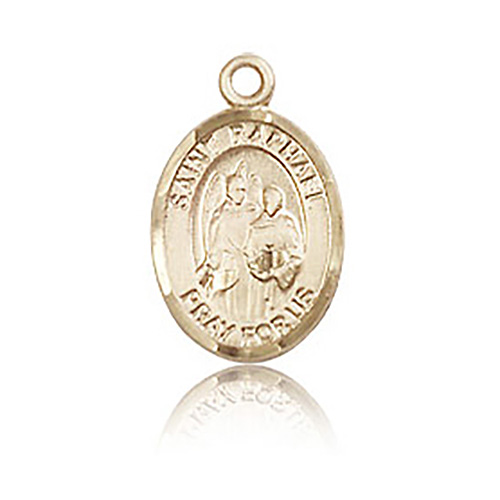 This very small oval St Raphael medal is made of polished, solid 14k yellow gold. Inscription: SAINT RAPHAEL PRAY FOR US. Dimensions: 1/2in x 1/4in. This item is half the size of a quarter. Made in USA.