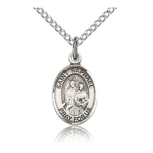 This very small, die struck oval St Raphael charm is made of sterling silver. 18-inch sterling silver lite curb chain with lobster clasp. Plain back. Dimensions: 1/2in x 1/4in. This item is half the size of a quarter. Made in USA.