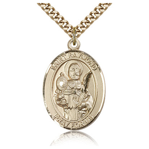 Gold filled sterling silver oval St Raymond medal dangles from a 24-inch stainless steel, endless heavy curb chain with gold plating. Die struck, hand-engraved. Inscription: SAINT RAYMOND PRAY FOR US. Dimensions: 1in x 3/4in. This item is the size of a quarter. Made in USA.
