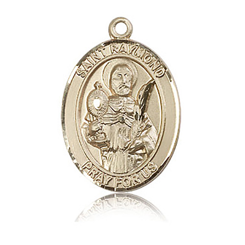 Die struck, hand-engraved medal is made of polished, solid 14kt yellow gold. Inscription: SAINT RAYMOND PRAY FOR US. Dimensions: 1in x 3/4in. This item is the size of a quarter. Made in USA.