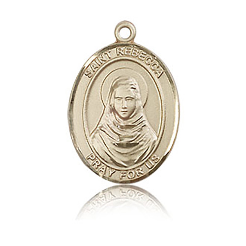 This ladies' 14k yellow gold oval St Rebecca medal is die struck and hand-engraved. Inscription: SAINT REBECCA PRAY FOR US. Dimensions: 3/4in x 1/2in. This item is the size of a penny. Made in USA.