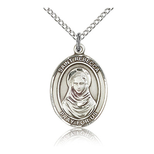 Die struck, hand-engraved medal. Inscription: SAINT REBECCA PRAY FOR US. Free 18-inch sterling silver lite curb chain with lobster clasp. Dimensions: 3/4in x 1/2in. This item is the size of a penny. Made in USA.