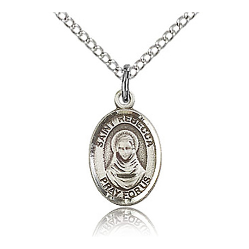 Die struck, hand-engraved St Rebecca charm. Free 18-inch sterling silver lite curb chain with lobster clasp. Plain back. Dimensions: 1/2in x 1/4in. This item is half the size of a quarter. Made in USA.