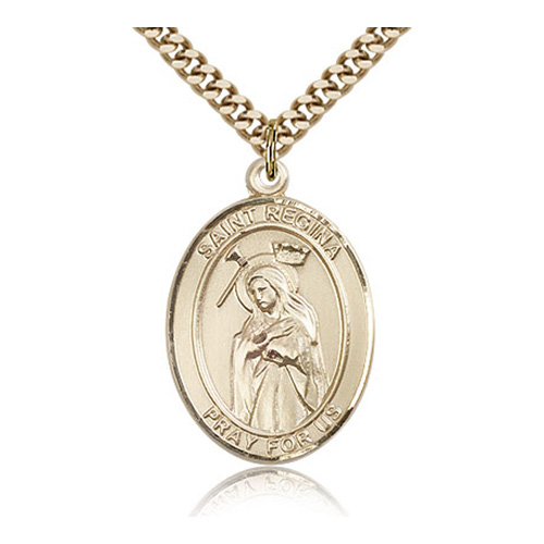 Gold filled sterling silver oval St Regina medal dangles from a 24-inch stainless steel, endless heavy curb chain with gold plating. Die struck, hand-engraved. Inscription: SAINT REGINA PRAY FOR US. Dimensions: 1in x 3/4in. This item is the size of a quarter. Made in USA.