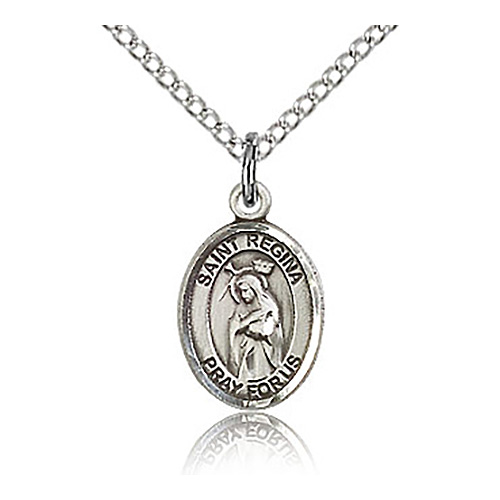 Die struck, hand-engraved St Regina charm. Free 18-inch sterling silver lite curb chain with lobster clasp. Plain back. Dimensions: 1/2in x 1/4in. This item is half the size of a quarter. Made in USA.