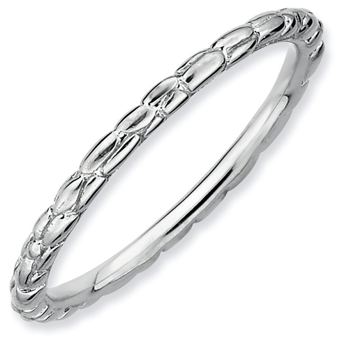 This band is made of polished sterling silver with rhodium plating. Distinctive twisted design. Width: 1.5mm. Metal weight: 1.62 grams. Available in whole finger sizes only, 5-10. Imported. Part of the Stackable Expressions collection.