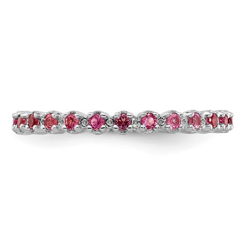 Sterling silver stackable ring has prong set pink tourmalines all the way around the ring. Approximate gemstone total weight: 0.44 carats. Ring width: 2.25mm. Metal weight: 2 grams. Available in whole finger sizes only, 5-10. Import. Part of the Stackable Expressions collection.