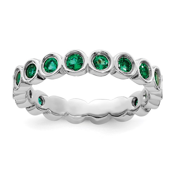 Bezel-set created emerald stackable ring is made of polished sterling silver. Created emerald approximate total weight: 1.11 carats. Width: 3.5mm. Metal weight: 2.5 grams. Available in whole finger sizes only, 5-10. Imported. Part of the Stackable Expressions collection.