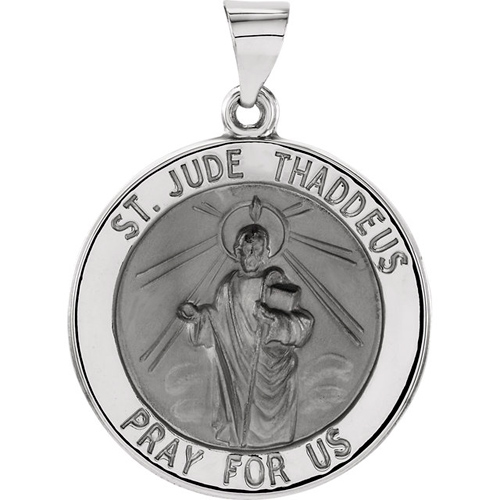 Hollow, round St Jude medal is made of polished 14k white gold. Dimensions: 22.25mm in diameter. This item is the size of a nickel. Engraved: ST. JUDE THADDEUS PRAY FOR US.Item weighs 1.94 grams. Please note: weight is approximate, actual weight may vary. Chain not included. Bail size: 5.0mm. We recommend a chain no wider than 4.0mm.