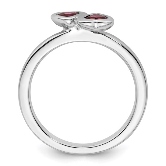 Polished sterling silver stackable ring boasts two heart shaped rhodolite garnets. Approximate gemstone total weight: 0.65 carats. Metal weight: 3.27 grams. Available in whole finger sizes only, 5-10. Imported. Part of the Stackable Expressions collection.