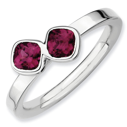 Two bezel set cushion cut rhodolite garnets sit atop this sterling silver stackable ring. Gemstone total weight: 0.9 carats. Ring width: 2.25mm. Metal weight: 3.0 grams. Import. Part of the Stackable Expressions collection.