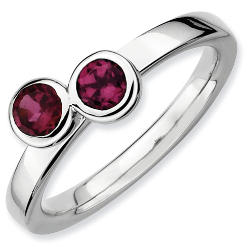 Two bezel set round brilliant cut rhodolite garnets sit atop this sterling silver stackable ring. Approximate gemstone total weight: 0.7 carats. Ring width: 2.25mm. Metal weight: 3.45 grams. Imported. Part of the Stackable Expressions collection.