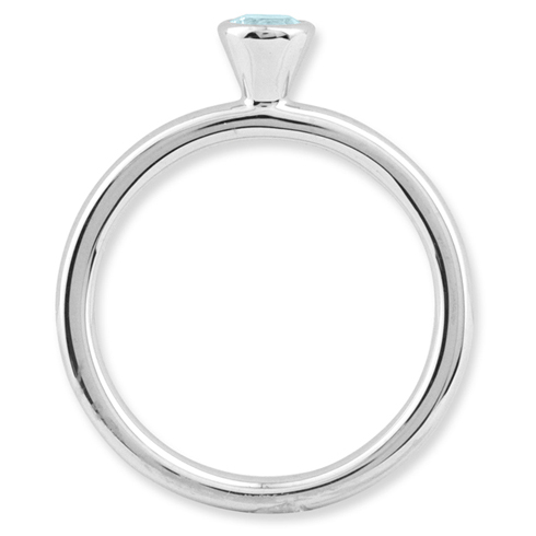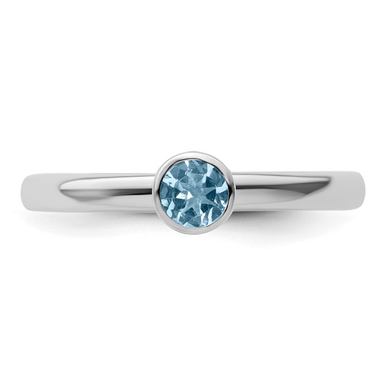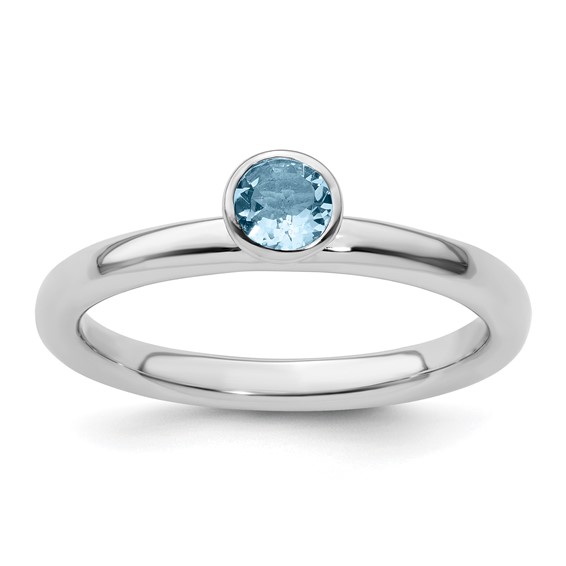 Polished sterling silver stackable ring features a 4mm round aquamarine in a high profile bezel setting. Aquamarine total weight: 0.23 carats. Ring width: 2.25mm. Metal weight: 2.77 grams. Available in whole finger sizes only, 5-10. Imported. Part of the Stackable Expressions collection.