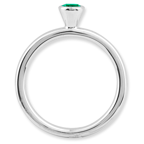 Polished sterling silver stackable ring features a 4mm round created emerald in a high profile bezel setting. Created emerald approximate total weight: 0.24 carats. Metal weight: 2.77 grams. Available in whole finger sizes only, 5-10. Import.