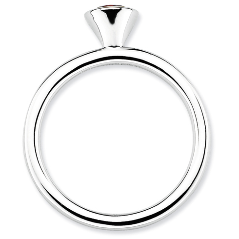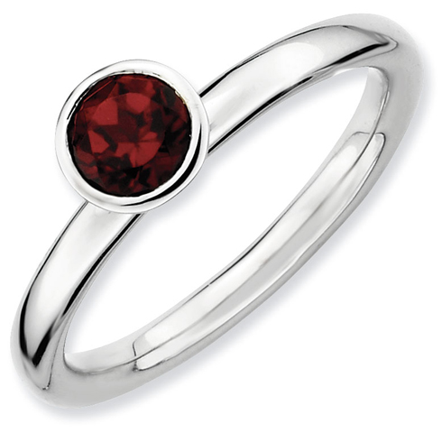Polished sterling silver stackable ring features a 5mm round garnet in a high profile bezel setting. Genuine garnet total weight: 0.62 carats. Metal weight: 2.95 grams. Available in whole finger sizes only, 5-10. Import. Part of the Stackable Expressions collection.