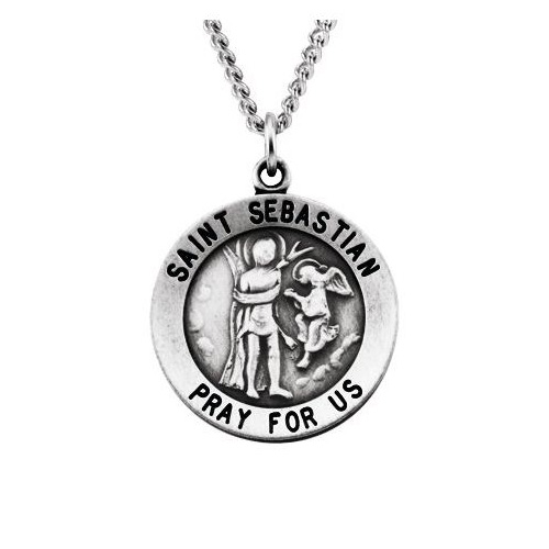 This ladies' solid sterling silver St Sebastian medal includes a sterling silver 18-inch rope chain. Inscription reads: SAINT SEBASTIAN PRAY FOR US. Dimensions: 18mm diameter, the size of a dime. Weighs 2.32 grams. Please note: weight is approximate, actual weight may vary. Made in USA.