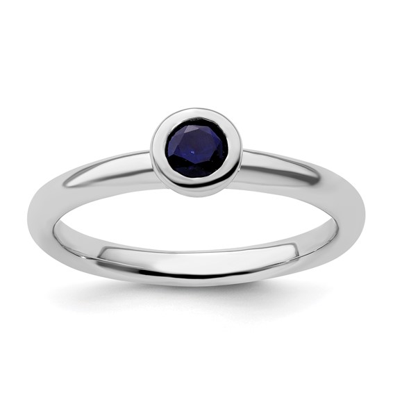 Sterling silver 4mm created sapphire ring has a low profile bezel setting. Approximate gemstone total weight: 0.32 carats. Metal weight: 2.75 grams. Available in whole finger sizes only, 5-10. Imported. Part of the Stackable Expressions collection.