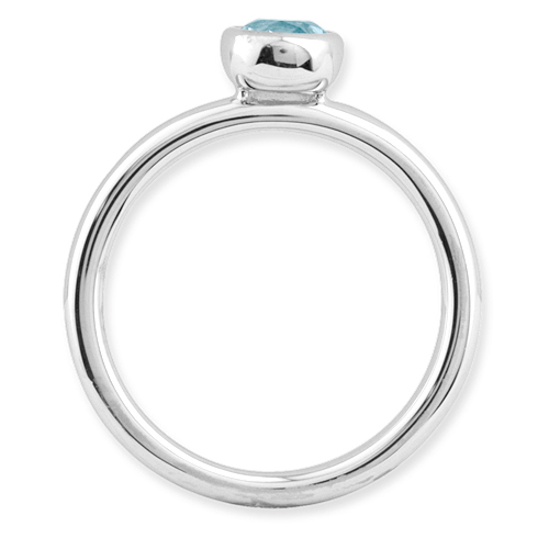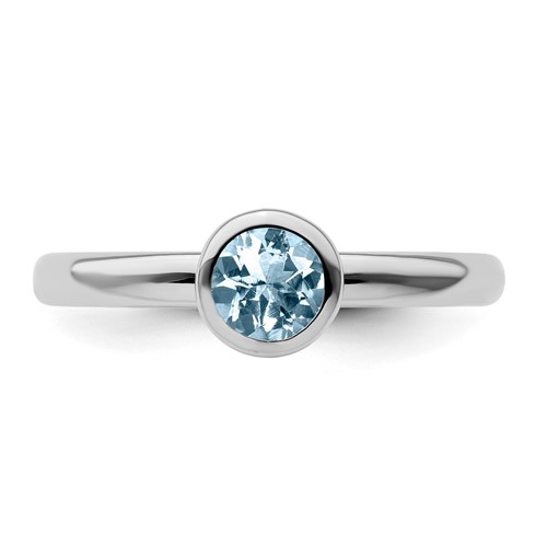 Sterling silver stackable ring has a 5mm aquamarine in a low profile bezel setting. Gemstone total weight: 0.49 carats. Ring width: 2.25mm. Metal weight: 2.95 grams. Available in whole finger sizes only, 5-10. Imported. Part of the Stackable Expressions collection.