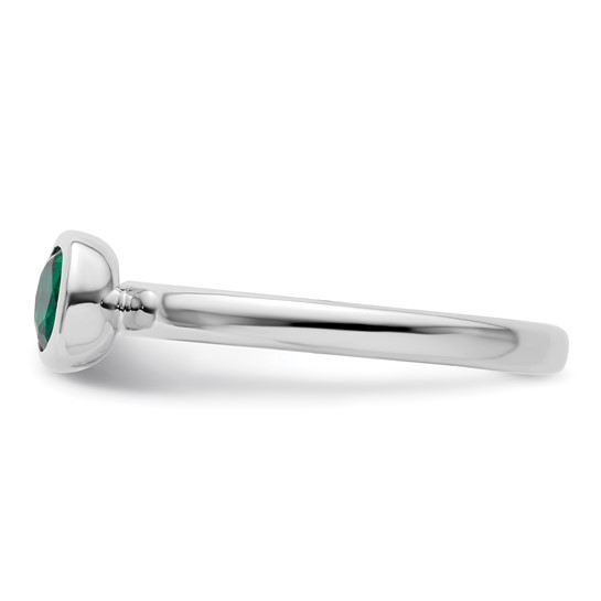 5mm created emerald stackable ring has a low profile bezel setting and is made of polished sterling silver. Approximate gemstone total weight: 0.46 carats. Ring width: 2.25mm. Metal weight: 2.95 grams. Available in whole finger sizes only, 5-10. Imported. Part of the Stackable Expressions collection.