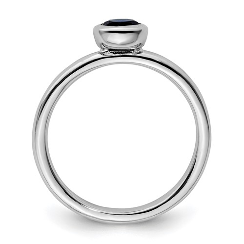 5mm created sapphire stackable ring has a low profile bezel setting and is made of polished sterling silver. Approximate gemstone total weight: 0.74 carats. Ring width: 2.25mm. Metal weight: 2.95 grams. Available in whole finger sizes only, 5-10. Imported. Part of the Stackable Expressions collection.