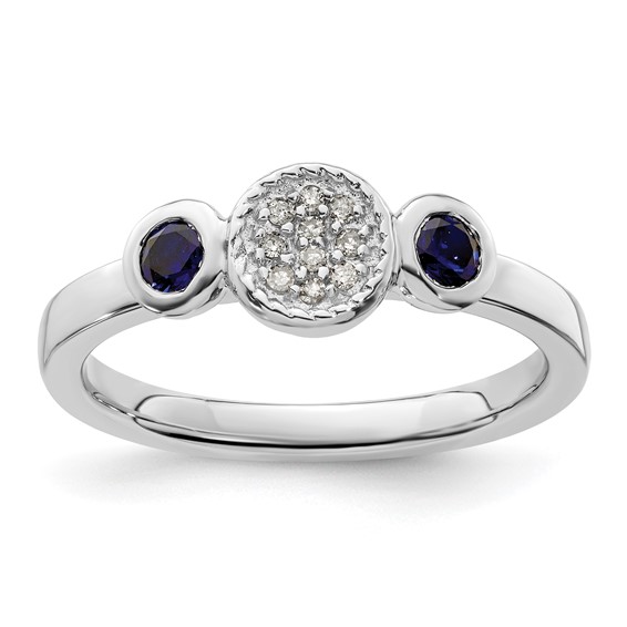 Sterling silver stackable ring has a cluster of diamond accents flanked by two round created sapphires. Diamond and created sapphire total weight: 0.05 and 0.28 carats respectively. Width: 2.25mm. Metal weight: 3.45 grams. Available in whole finger sizes only, 5-10. Imported. Part of the Stackable Expressions collection.