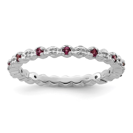Sterling silver eternity style ring features alternating round rhodolite garnets and diamonds. Approximate diamond and rhodolite garnet total weight: 0.04 and 0.34 carats respectively. Metal weight: 2 grams. Available in whole finger sizes only, 5-10. Imported. Part of the Stackable Expressions collection.