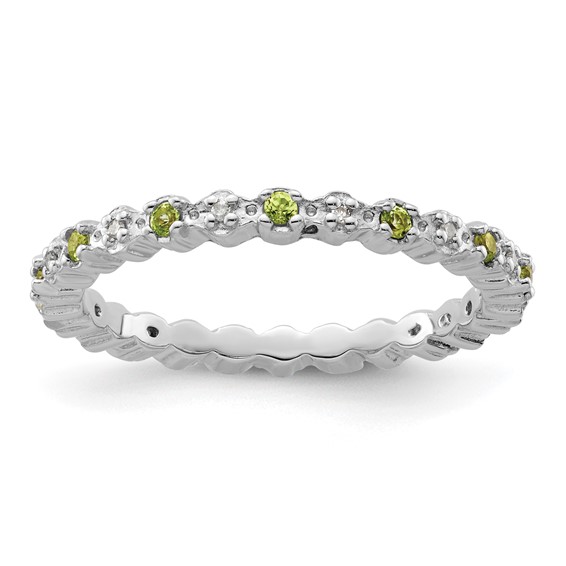 Polished sterling silver stackable eternity ring has is set with alternating peridots and diamonds all the way around the ring. Approximate diamond and gemstone total weight: 0.04 and 0.21 carats respectively. Metal weight: 2 grams. Available in whole finger sizes only, 5-10. Imported. Part of the Stackable Expressions collection.