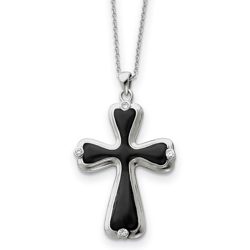 This sterling silver ladies' black enameled cross has four cubic zirconia accents. Cross length: 1in. 18in sterling silver chain. There are four beads on this cross that represent that God is: 1) Your shelter, 2) Your refuge, 3) Your place of safety, and 4) Your God. Weight: 8.31 grams.Each piece of Sentimental Expressions Jewelry comes pre-packaged in a magnetic gift box. Also included is a poem card with the poem & verse printed in English on one side and Spanish on the other.Title: My RefugeVerse: Those who live in the shelter of the most high will find rest in the shadow of the Almighty. This I declare of the Lord: He alone is my refuge, my place of safety; He is my God, and I am trusting Him. For He will rescue you from every trap and protect you from the fatal plague. He will shield you with His wings. He will shelter you with His feathers. His faithful promises are your armor and protection. Do not be afraid of the terrors of the night, nor fear the dangers of the day, nor dred the plague that stalks in darkness, nor the disaster that strikes at miday. Though a thousand fall at your side, though ten thousand are dying around you, these evils will not touch you. But you will see it with your eyes; you will see how the wicked are punished. If you make the Lord your refuge, if you make the Most High your shelter, no evil will conquer you; no plaque will come near your dwelling. For He orders his angels to protect you wherever you go. They will hold you with their hands to keep you from striking your foot on a stone. You will trample down lions and poisonous snakes; you will crush fierce lions and serpents under your feet! The Lord says, "I will rescue those who love me.I will protect those who trust in my name. When they call on me, I will answer; I will be with them in trouble. I will rescue them and honor them. I will satisfy them with a long life and give them salvation." -Psalm 91