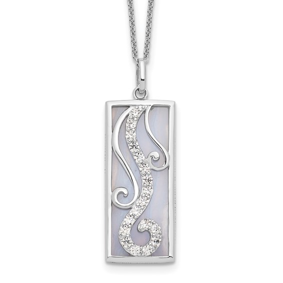 Blue lace agate and living water necklace is made of polished sterling silver. Cubic zirconia accents. Pendant length: 1in. Sterling silver 18in chain has a spring ring clasp. Weight: 3 grams.Each piece of Sentimental Expressions Jewelry comes pre-packaged in a stylish magnetic gift box, to protect the jewelry that has so much to say. Also included is a poem card with the poem & verse printed in English on one side and Spanish on the other.History: Living Water The spirit of living water Flows from my heart. Jesus lives within me. We are never apart. He fills my cup and Washes away my stain. He has set me free. I am not the same. Streams of living water Now dwells in my soul. I am one with the spirit I've given up control. I am forever grateful Knowing I belong to You. Jesus I wanted You to know How much I love You, too. Deborah J. Birdoes 1-25-2009Verse: Anyone who is thirsty may come to me! Anyone who believes in me may come and drink! For the Scriptures declare, "Rivers of living water will flow from His heart." -John 7:17-18Message: