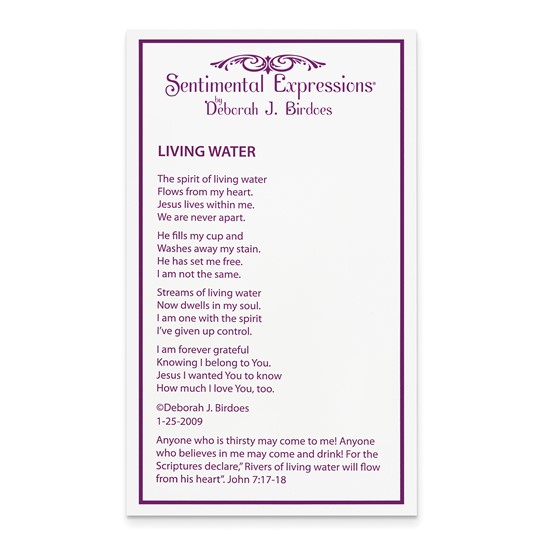 History: Living Water The spirit of living water Flows from my heart. Jesus lives within me. We are never apart. He fills my cup and Washes away my stain. He has set me free. I am not the same. Streams of living water Now dwells in my soul. I am one with the spirit I've given up control. I am forever grateful Knowing I belong to You. Jesus I wanted You to know How much I love You, too. Deborah J. Birdoes 1-25-2009