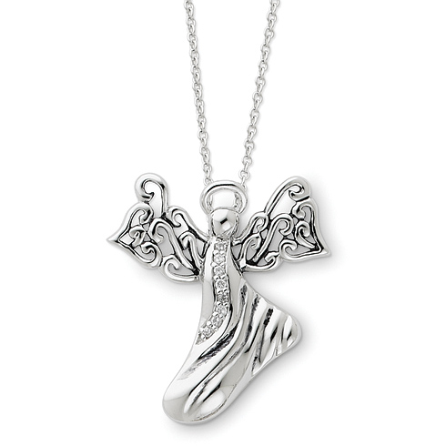 Polished sterling silver angel necklace features cubic zirconia accents. Dimensions: 1 1/8in x 1in. Weight: 4.75 grams.Each piece of Sentimental Expressions Jewelry comes pre-packaged in a stylish magnetic gift box, to protect the jewelry that has so much to say. Also included is a poem card with the poem & verse printed in English on one side and Spanish on the other. This angel is dedicated to those who have hope in any given circumstance. When hope dwells in your heart, nothing is impossible. When the world says to just give up, they are the ones that give it one more try. The road ahead of them always has a light waiting for them. Those that carry hope in their heart are motivated by an inner strength for they know that hope will not abandon them. Verse: You are my refuge and my shield; I have put my hope in Your word. -Psalm 119:114Message: "Hope is faith holding out its hand in the dark." -George lles