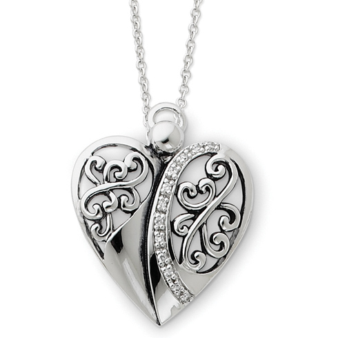 Angel of love necklace is made of polished sterling silver. Heart shaped pendant has cubic zirconia accents. Sterling silver 18in chain has a spring ring clasp. Weight: 4.86 grams.Each piece of Sentimental Expressions Jewelry comes pre-packaged in a stylish magnetic gift box, to protect the jewelry that has so much to say. Also included is a poem card with the poem & verse printed in English on one side and Spanish on the other.History: Angel of Love This angel is dedicated to those in love. Love is what makes the world a better place. It keeps us warm on winter nights and helps us embrace life with a smile. Even in silence, the heart of love will still speak to you. No one will ever know how much the heart can hold until they discover true love. Verse: Love never gives up, never loses faith, is always hopeful, and endures through every circumstance. -I Corinthians 13:8Message: "Love puts the fun in together, the sad in apart, and the joy in a heart." -Author Unknown