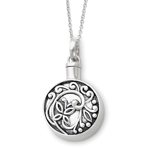 This round ash holder necklace has a filigree design and is made of polished sterling silver with antique finish. Designed by Deborah Birdoes. Item size: 7/8in x 7/8in without bail. Sterling silver 18in chain has a spring ring clasp. Weight: 11.31 grams.Each piece of Sentimental Expressions Jewelry comes pre-packaged in a stylish magnetic gift box, to protect the jewelry that has so much to say. Also included is a poem card with the poem & verse printed in English on one side and Spanish on the other.History: Each Rememberance Ash Holder comes with a twist-on top, a funnel and black pouch. Choose the Rememberance Ash Holder that best represents your lost loved one. Verse: In that day he will remove the cloud of gloom, the shadow of death hangs over the earth. He will swallow up death forever! The Sovereign Lord will wipe away all tears. -Isaiah 25:7-8 Even when I walk through the dark valley of death, I will not be afraid for You are close beside me. Your rod and Your staff comfort me. -Psalm 23:4 Lord, now let Thy servant depart in peace, according to Thy word. -Luke 2:29 Message: "For death begins with life's first breath and life begins at the touch of death." -John Oxenham
