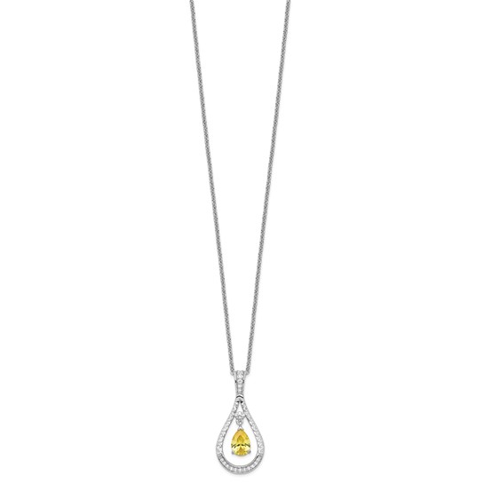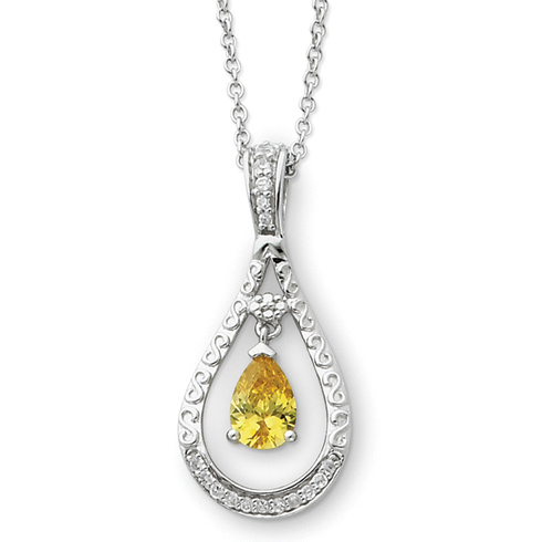 Sterling silver teardrop shaped necklace has a golden pear cubic zirconia. Chain length: 18in. Weight: 3.19 grams.Each piece of Sentimental Expressions Jewelry comes pre-packaged in a stylish magnetic gift box, to protect the jewelry that has so much to say. Also included is a poem card with the poem & verse printed in English on one side and Spanish on the other.History: Never Forget Tear This Never Forget Tear is for those of us that want to celebrate, cherish or remember for any occasion the month that your memory happened. It was designed to make you smile and for some to just comfort your heart.Verse: It is right that I should feel as I do about you, for you have a very special place in my heart. -Philippians 1:17Message: "Those who have shown us love, brought us joy, and made us laugh have given us the lasting gifts of a beautiful life-and blessed our memories forever." -Bonnie Jensen