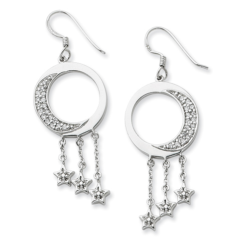 'I Promise You the Moon and the Stars' dangle earrings in polished sterling silver with Cubic Zirconia accent stones. Weight: 5.59 grams.Each piece of Sentimental Expressions Jewelry comes pre-packaged in a stylish magnetic gift box, to protect the jewelry that has so much to say. Also included is a poem card with the poem & verse printed in English on one side and Spanish on the other.History: I Promise You the Moon and Stars If I could climb to the heavenlies I'd pick three stars for you. Each one for our past, present and future. To show I love you as I do. For today with you is a gift With all of its joy and sorrow. Holding the memories of yesterday As well as the promise of tomorrow. Just like the stars and moon above You illuminate my soul. Capturing my heart again and again More than you'll ever know. ©Deborah J. Birdoes 3-19-2006Verse: Give thanks to him who made the heavenly lights-His faithful love endures forever. ...and the moon and stars to rule the night. His faithful love endures forever. -Psalm 136:1,10Message: