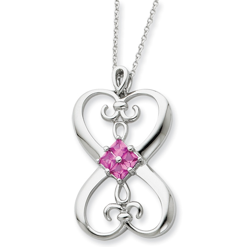 Loyalty necklace features four square pink cubic zirconia stones and two intertwined hearts. Polished sterling silver. Sterling silver 18in chain has a spring ring clasp. Weight: 6.59 grams.Each piece of Sentimental Expressions Jewelry comes pre-packaged in a stylish magnetic gift box, to protect the jewelry that has so much to say. Also included is a poem card with the poem & verse printed in English on one side and Spanish on the other.History: Loyalty We cry until we laugh And laugh until we cry. A friendship made in heaven. That is you and I. We lift each other up If one happens to be down. Putting a smile on the face, Wiping out the frown. Sharing what we know, Our secrets we confide. We're there for each other, Walking side by side. For a friend is always loyal, And faithful to the end. Thank you for being there, My loyal, faithful friend. ©Deborah J. Birdoes 4-20-2006Verse: "A friend is always loyal, and a brother is born to help in time of need." -Proverbs 17:17Message: